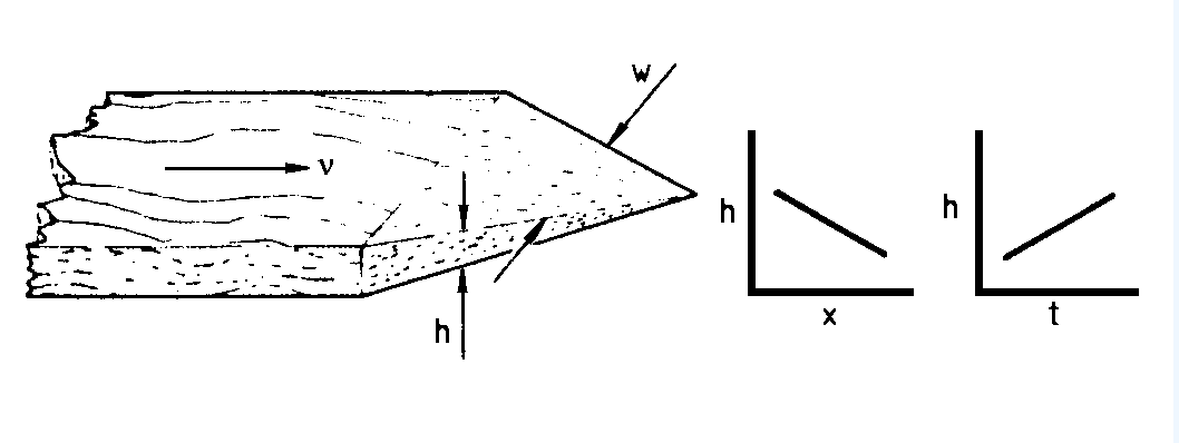 Betrachten wir eine Holzplanke, die zu einem vorne liegenden Punkt spitz zuläuft und sich mit einer Geschwindigkeit v bewegt. Das Querschnitts-Verhältnis der Holzplanke ist z. Höhe und Breite an jedem Punkt sind mit h und w bezeichnet. Innerhalb des spitz zulaufenden Abschnitts bleibt das Verhältnis von Höhe zu Breite gleich z.