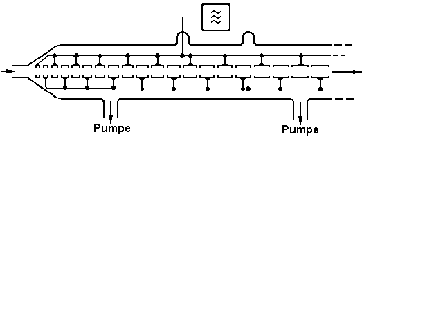 Betrachten wir den physikalischen Sachverhalt etwas näher. Die zu beschleunigenden Teilchen, das sind Elektronen oder andere geladene Elementarteilchen, werden durch ein elektro-statisches Feld beeinflußt und werden dadurch aus der Ruhelage (relativ zum Beschleuniger) in einen Bewegungszustand versetzt. Dieser Methode sind allerdings Grenzen gesetzt, da die erregenden elektrischen Spannungen und die zu überbrückenden Entfernungen nicht beliebig groß gemacht werden können. Deshalb wird er Beschleunigungsvorgang in einzelne Teilabschnitte zerlegt. Es werden sogenannte Driftröhren in einer linearen räumlichen Anordnung hintereinander geschaltet (Linear-Beschleuniger BILD 2), so daß jeweils zwischen zwei Driftröhren eine Geschwindigkeits-Erhöhung gegenüber dem Vorabschnitt erreicht wird.
